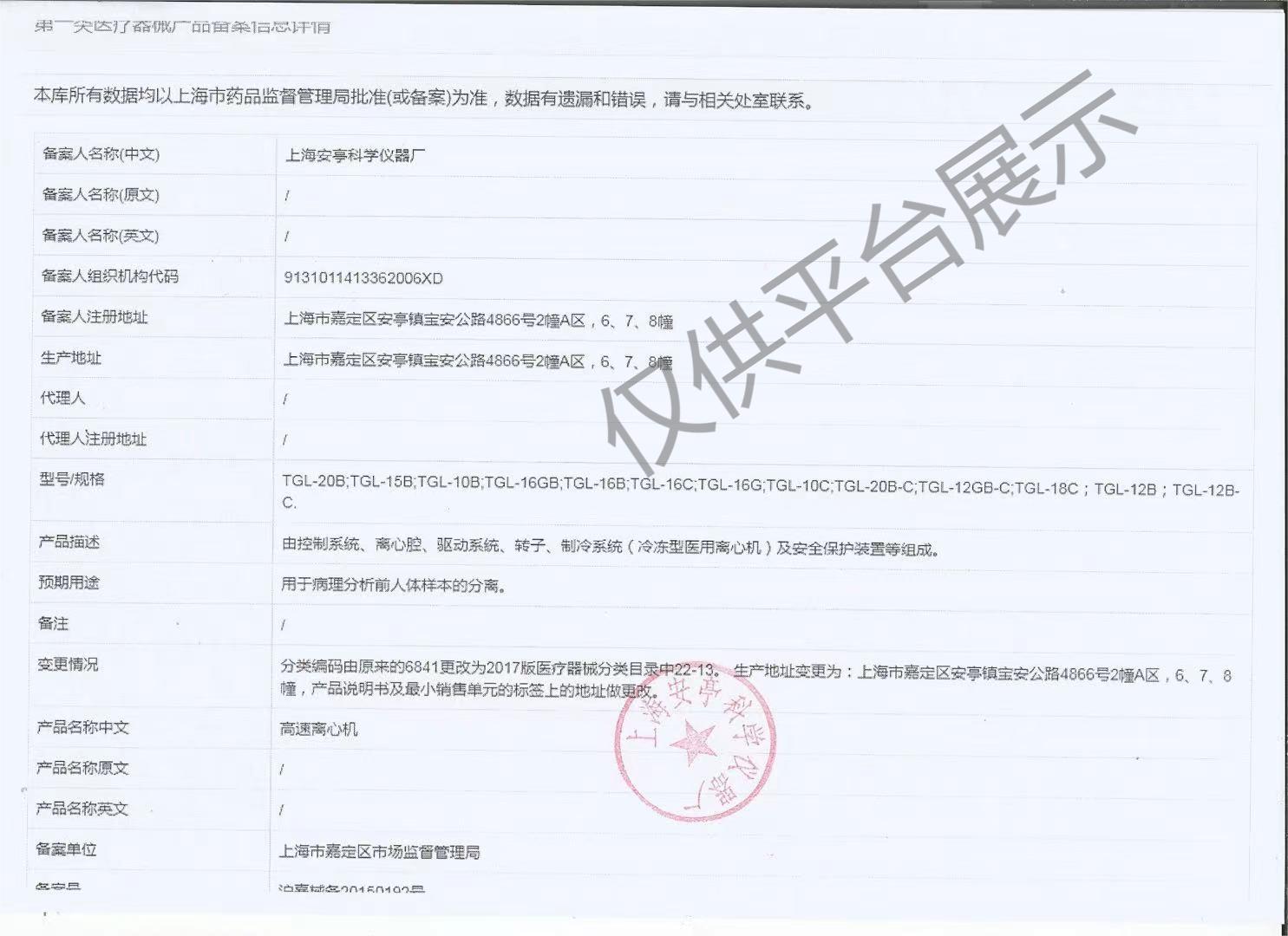上海安亭/飛鴿牌高速立式離心機(jī)TGL-16GB |